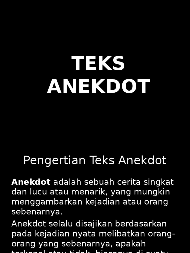 Teks anekdot adalah sebuah cerita singkat dan lucu atau menarik yang mana menggambarkan kejadian atau orang sebenarnya.