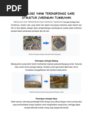 Jaringan adalah sekelompok sel yang mempunyai struktur dan fungsi yang sama dan terikat oleh bahan antarsel membentuk suatu kesatuan. Contoh teknologi yg terinspirasi dari tumbuhan berserta keterangannya.
