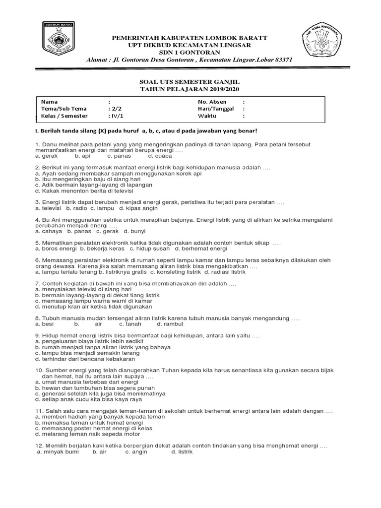 Soal Tematik Kelas 4 Tema 2 Hemat Energi Digunakan Untuk